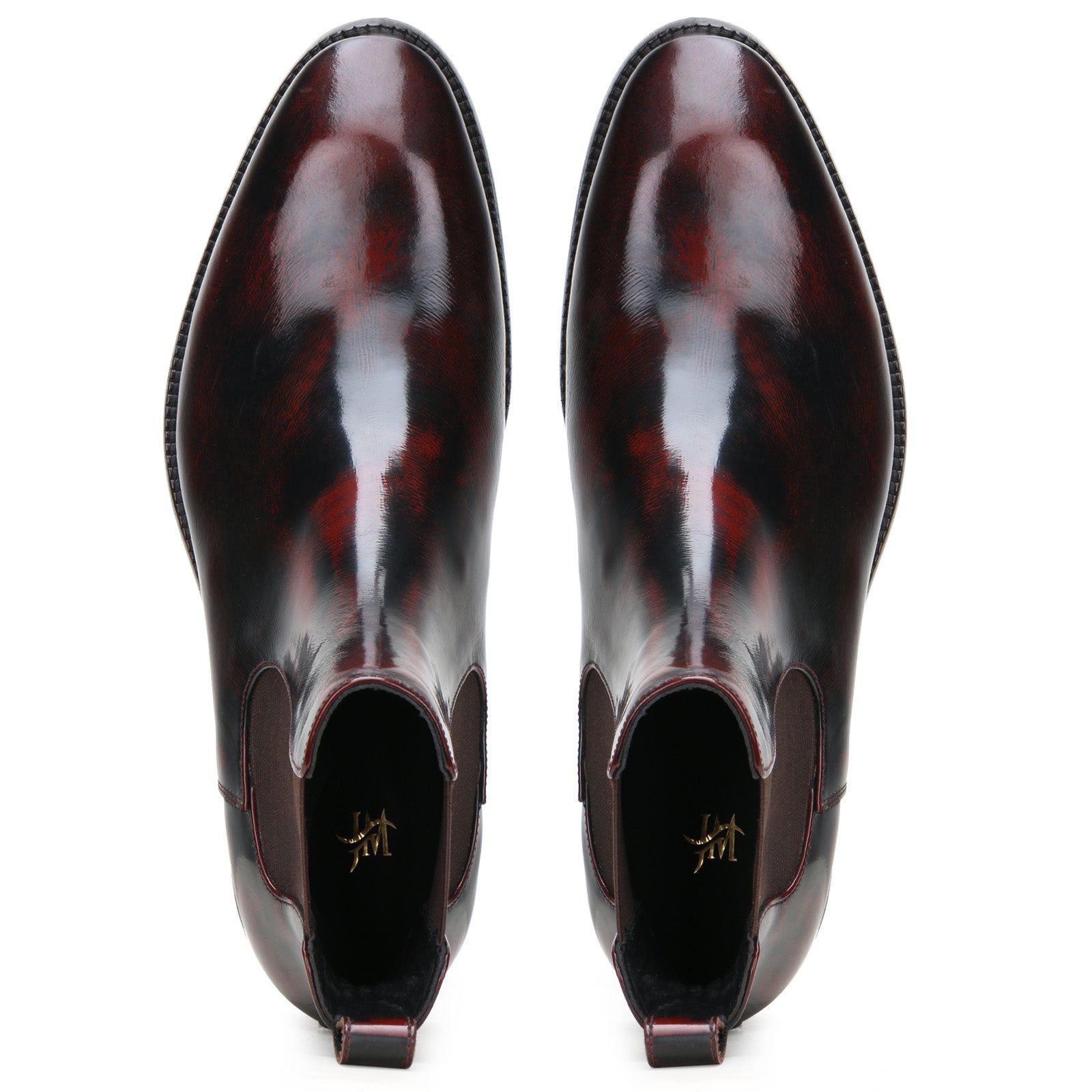 Crafted from brushed-off leather in deep cherry hues, Jackob Martin’s vintage boots echo timeless refinement—free of perforation yet rich in character, where each handcrafted detail honors classic design with understated soul.