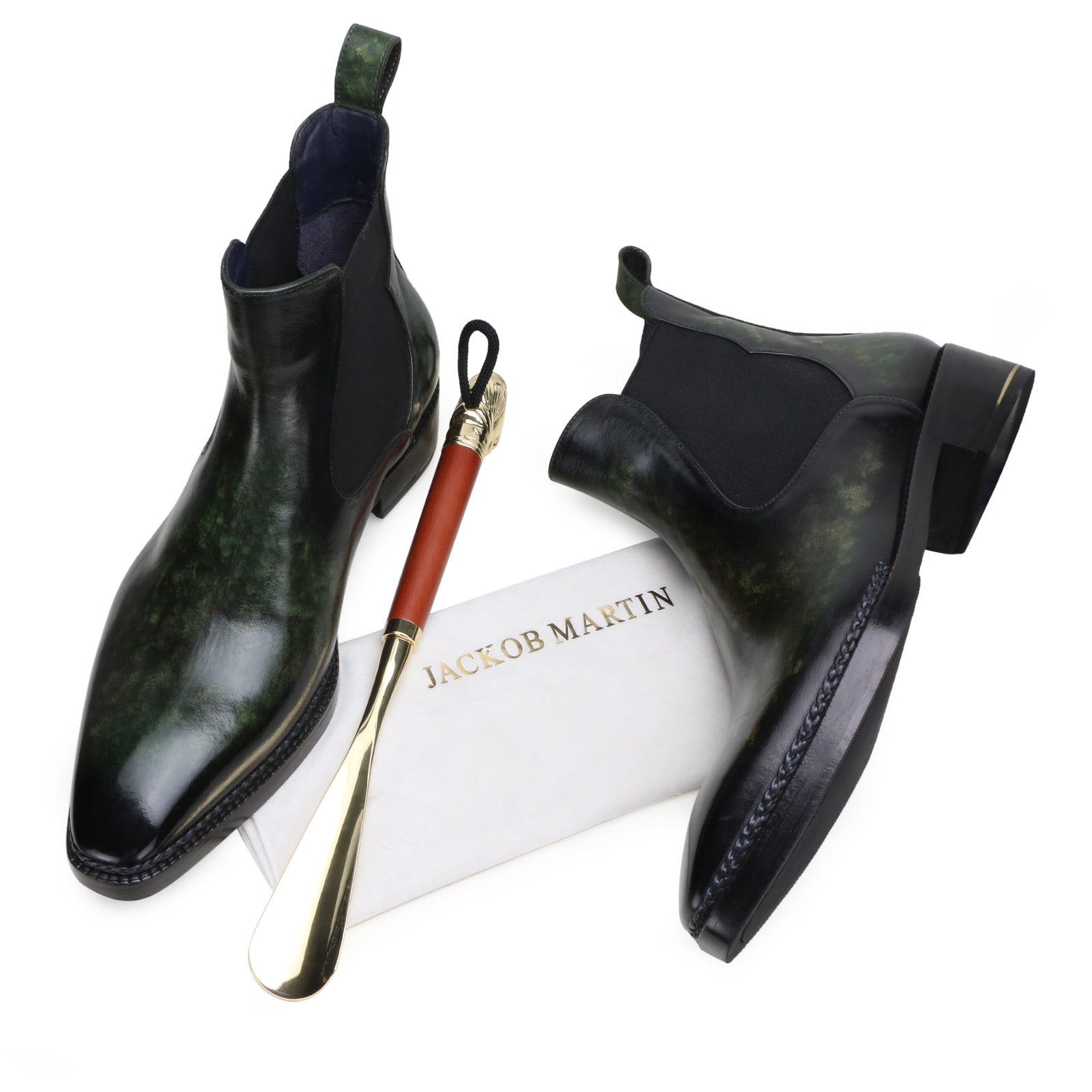 Echoes of a forgotten era—Jackob Martin’s handpatina chelsea boots are handcrafted relics, kissed with a deep patina, grounded by a leather sole and sealed with a welt forged in tradition.