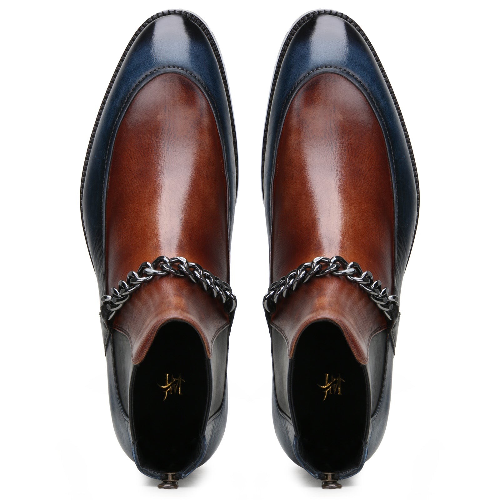 Jackob Martin’s handcrafted dual-tone Chelsea boots blend timeless silhouette with daring edge—featuring contrasting leathers, a striking metal chain accent, and grounded on classic leather soles for a statement rooted in heritage and rebellion.